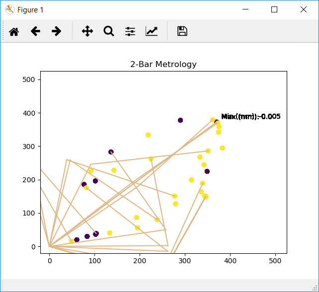 Figuring out the trig was relatively straightforward, but there's a caveat which is that as soon as your second arm leaves the 180 deg interior angle of the first (and again after 270) you have to make a few small adjustments to the plotting script. This led me to a day wrangling with plots that looked like the one below. You can see all of the trig in twoBarMetrollogyCollection.py. The plotting script is currently computing the trig for every point, for every frame, because I was lazy about moving from the plotting a complete array to the real time case. I haven't run into any memory limitations yet because most of my plots have been limited to under 2ish minutes.