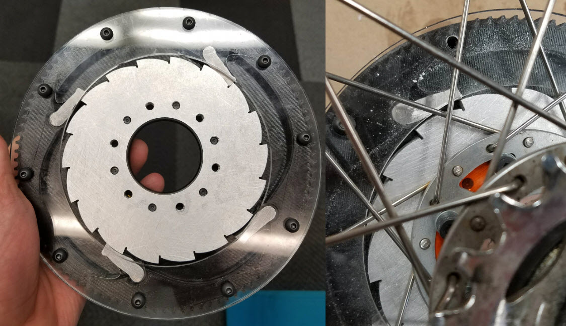 The motor is mounted between the seat stays and seat tube and is geared down to the rear wheel with a 2-stage HTD 5mm timing belt reduction of about 10.6:1. I started with a large plywood rear pulley located concentrically with the hub of the rear wheel and zip tied to the spokes of the wheel. I foolishly thought it would be fun to design a freewheel and build it from scratch which you can see a picture of below. I designed and machined/printed all of the parts in the freewheel aside from the bearing. The pawls are machined from 5160 spring steel, but the ratchet I never got around to waterjetting it in something that wasn't aluminum (note the aluminum shavings in the mounted picture below). The freewheel worked for about 2 weeks of daily commuting and then jammed and failed catastrophically when the acrylic pawl retention cover cracked. Since then I haven't had the heart to return to the project, but will eventually replace the custom freewheel with an OTS one mounted to the hub and a waterjet sprocket.