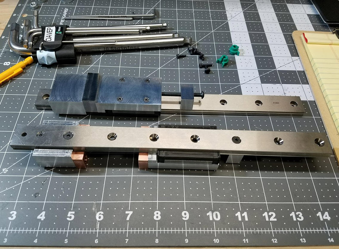Most machinest's vises use large castings and a lot of mass to ensure rigidity, but the philosophy here is to transmit as much of the clamping load into the base of the machine through the rail as quickly as possible. The moving jaw and nut post index along the mounting holes of the linear rail, so they have a 6" capacity with only 40 mm of stroke. Both the fixed jaw and nut post are mounted from underneath using M4 FHSCS, so the price to pay is that the vises need to be unmounted to adjust capacity. There's a captive nut in a pocket within the moving jaw that attaches to the tightening screw. All of the clamping load goes from the fixed jaw to the nut post, and the linear guide only takes up any moment from off-axis clamping which is relatively low unless you're using parallels.