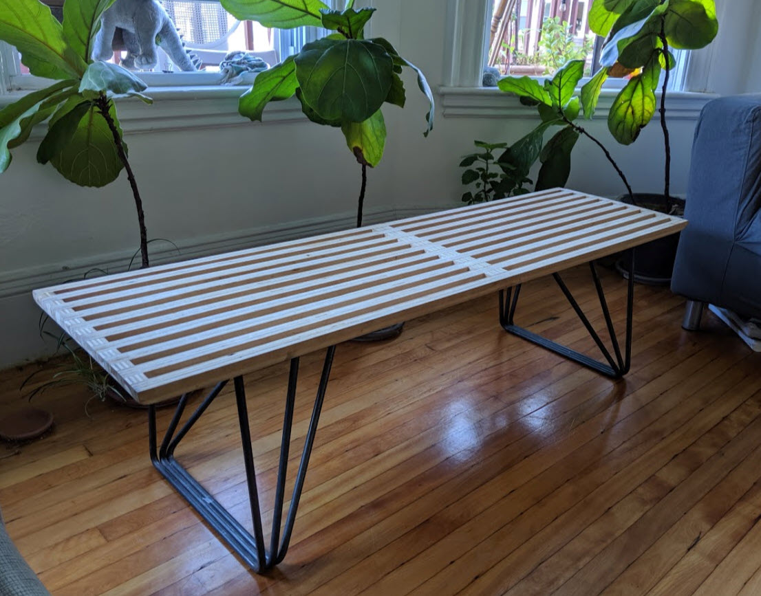 After building the bench top, I added the loft shown below, and fabricated a pair of steel legs inspired by mid-century style hairpin legs. Design constraints for the legs were that they be strong enough to support two people, and that their fastening method be hidden when looking at the bench from above. The final design achieves this by bracketing to each slat individually, which also helps in distrubuting load accross the depth of the bench. I built the legs with help from my uncle at ARP Design. In the future I hope to publish a more detailed walkthrough for this build, but have made the models available below!