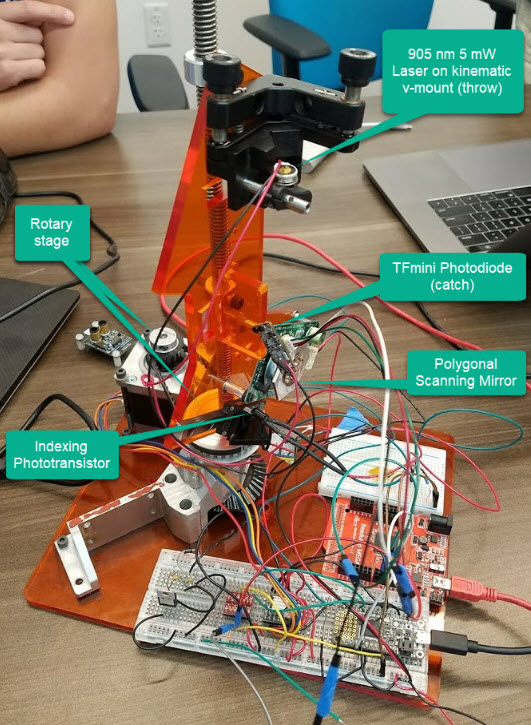 capable of scanning at 4kHz. But couldn't get it working and wound up falling back on a cheap off the shelf sensor called the TF mini, which we spliced our own laser into.